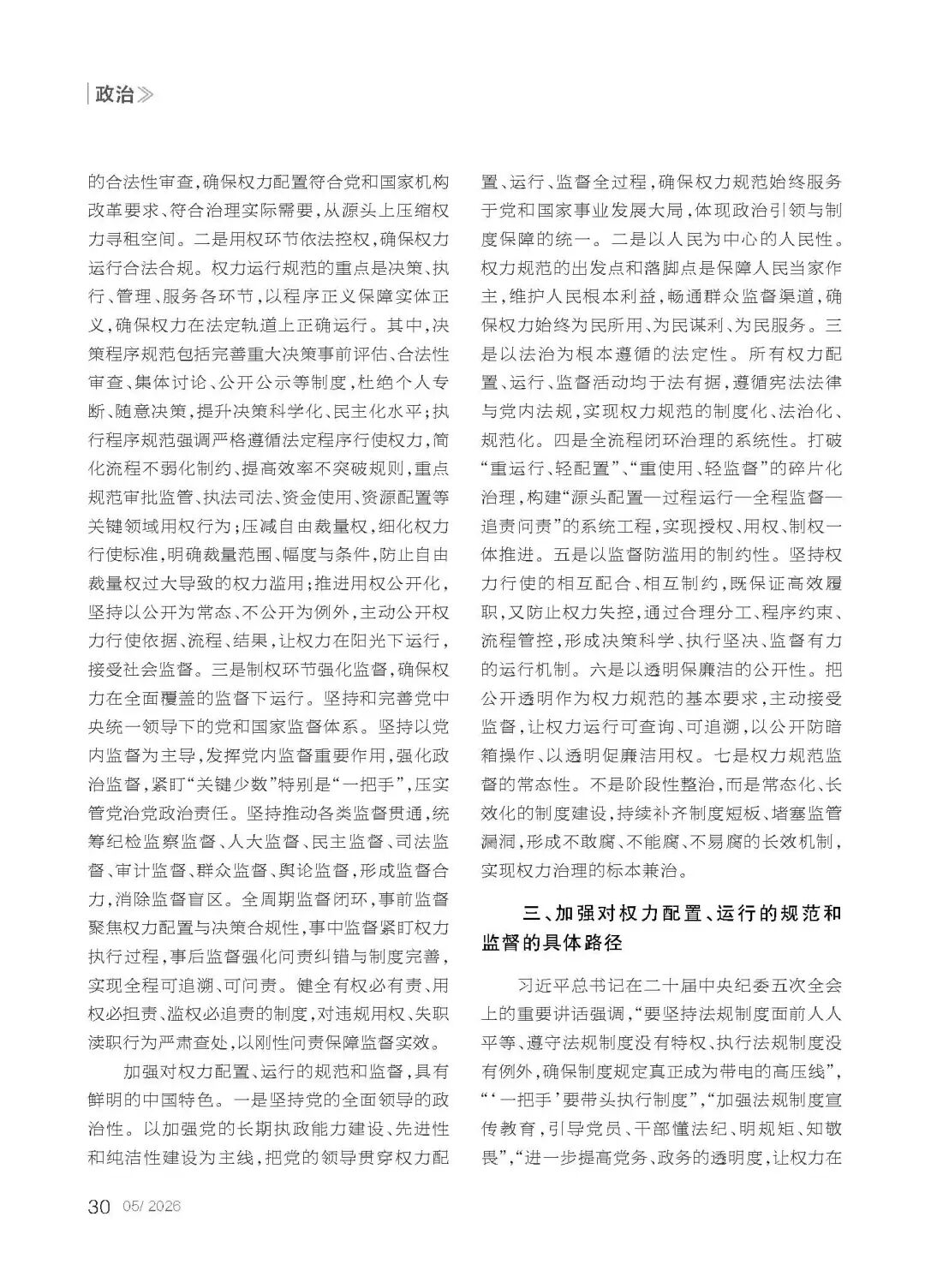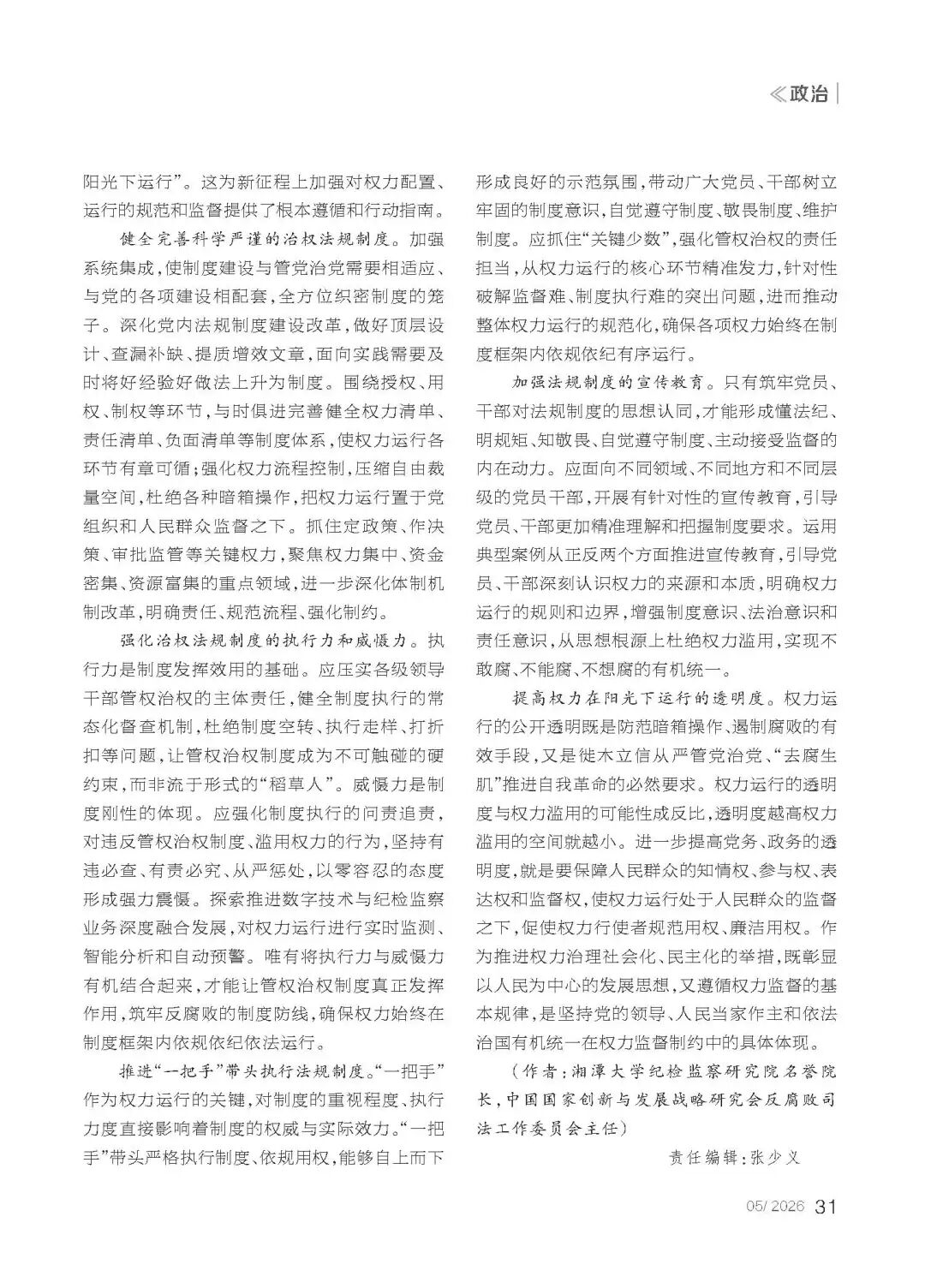 文章摘要:管党治党,关键是管权治权。党的二十届三中全会通过的《中共中央关于进一步全面深化改革、推进中国式现代化的决定》提出,“完善权力配置和运行制约机制”。党的二十届四中全会通过的《中共中央关于制定国民经济和社会发展第十五个五年规划的建议》提出,“完善党和国家监督体系,加强对权力配置、运行的规范和监督”。习近平总书记在二十届中央纪委五次全会上讲话时指出:“党的自我革命重在治权,把权力关进制度笼子是新时代全面从严治党的一项重要任务。”深入学习领会习近平总书记重要讲话精神,把握其深刻内涵和精髓要义,紧紧抓住“治权”这个党的自我革命重点,纵深推进全面从严治党,方能为“十五五”开局之年党中央各项决策部署的落实提供坚强保障。