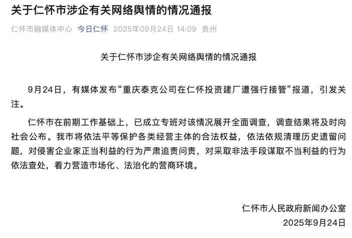 9月24日,有关媒体发布“重庆泰克公司在仁怀投资建厂遭强行接管”报道,仁怀市人民政府新闻办公室发布了情况通报。