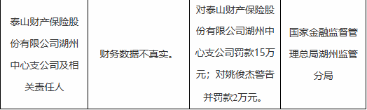公告显示,因财务数据不真实,对泰山财产保险股份有限公司湖州中心支公司罚款15万元;对姚俊杰警告并罚款2万元。