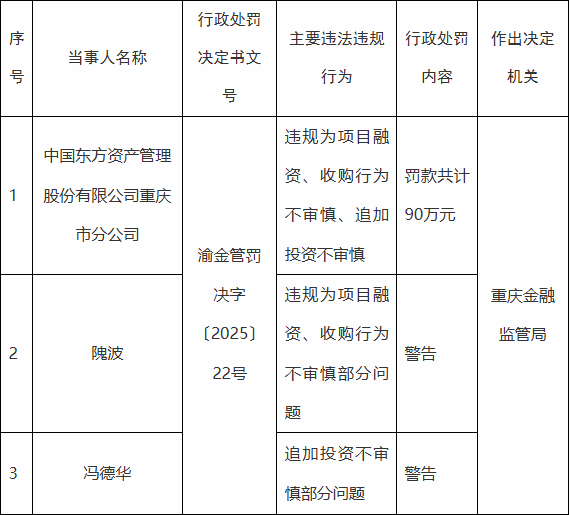 公告显示,因违规为项目融资、收购行为不审慎、追加投资不审慎,中国东方资产管理股份有限公司重庆市分公司被罚款90万元;因违规为项目融资、收购行为不审慎部分问题,隗波被警告;因追加投资不审慎部分问题,冯德华被警告。
