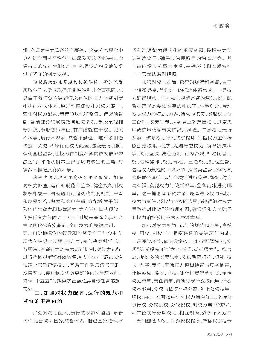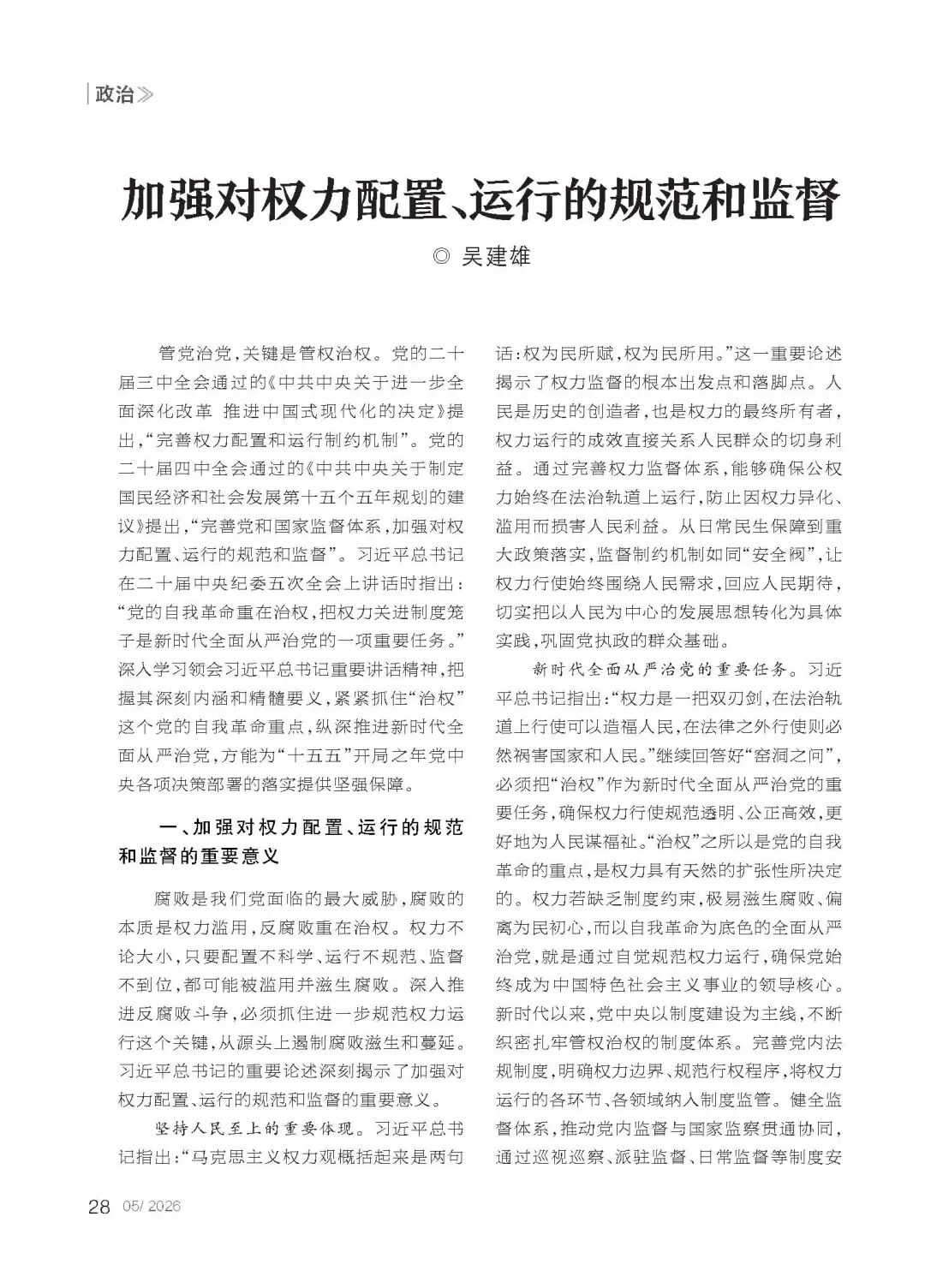 文章摘要:管党治党,关键是管权治权。党的二十届三中全会通过的《中共中央关于进一步全面深化改革、推进中国式现代化的决定》提出,“完善权力配置和运行制约机制”。党的二十届四中全会通过的《中共中央关于制定国民经济和社会发展第十五个五年规划的建议》提出,“完善党和国家监督体系,加强对权力配置、运行的规范和监督”。习近平总书记在二十届中央纪委五次全会上讲话时指出:“党的自我革命重在治权,把权力关进制度笼子是新时代全面从严治党的一项重要任务。”深入学习领会习近平总书记重要讲话精神,把握其深刻内涵和精髓要义,紧紧抓住“治权”这个党的自我革命重点,纵深推进全面从严治党,方能为“十五五”开局之年党中央各项决策部署的落实提供坚强保障。