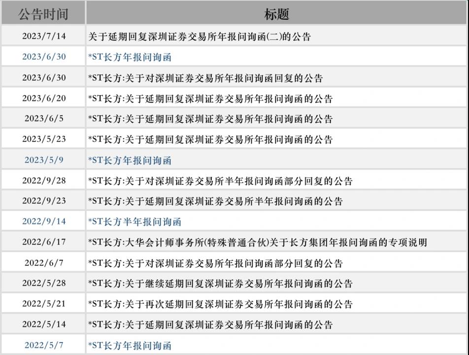 7月14日,长方集团公告,向深圳证券交易所申请延期至2023年7月31日前回复。此前的多份问询函均遭1~3次延期回复。
