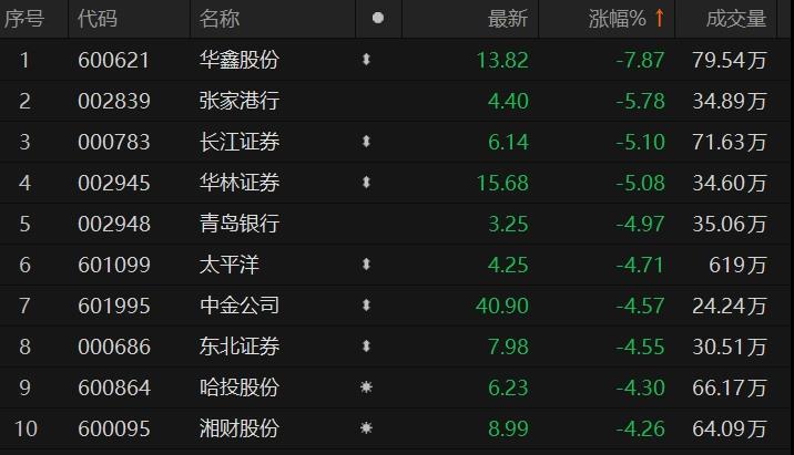 8月29日,金融板块震荡走低,截至10时19分,华鑫股份跌超7%,张家港行、长江证券、华林证券等跌超5%,青岛银行、太平洋、中金公司等多股跌超4%。