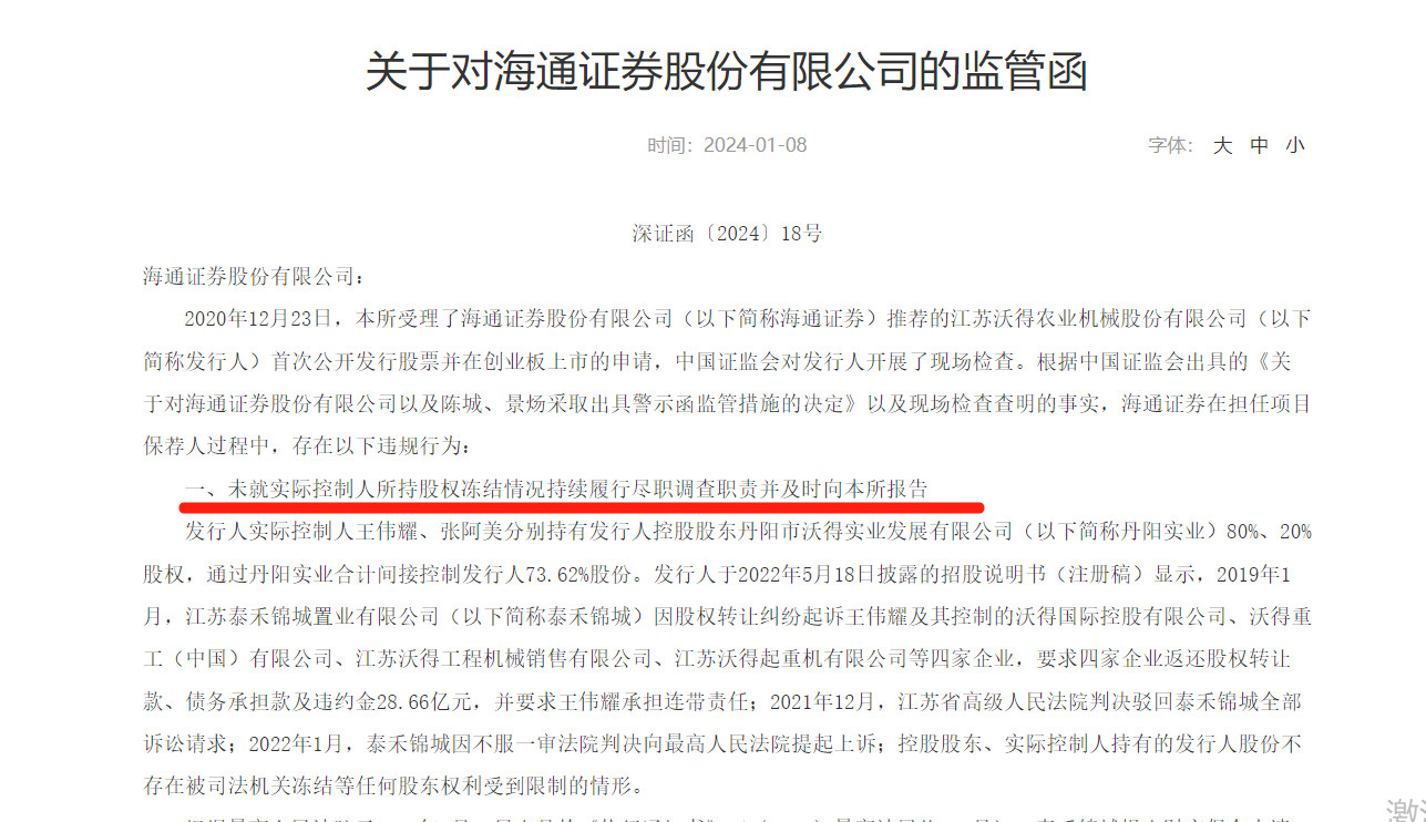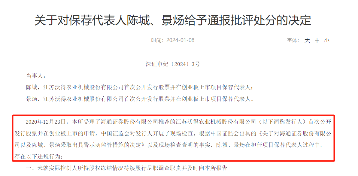 经查,海通证券及陈城、景炀在担任沃得农机IPO保荐人过程中,存在以下四方面违规行为,一是未就沃得农机实际控制人所持股权冻结情况,持续履行尽职调查职责并及时向深交所报告;二是对关联方资金拆借披露的准确性未予充分核实;三是未对发行人会计基础不完善、内部控制不规范的情况予以充分关注;四是未经证监会或深交所同意改动招股说明书。