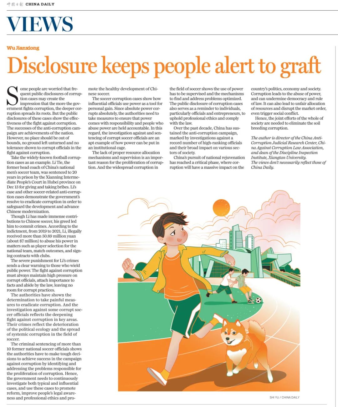 应《中国日报》之约,中国反腐败司法研究中心主任、湘潭大学纪检监察研究院院长吴建雄教授2025年1月10日在该报发表《案情公开使人民保持对腐败的警惕》一文。该文从备受关注的足球领域“李铁贪腐系列案”的公开披露入手,对2024年我国强化反腐败重点领域专项整治、严查隐性腐败和新型腐败、深化源头治理等问题发表见解。强调治理重点领域的腐败必须坚持把办案放在突出位置,不断提高发现和查处问题的能力,坚持把腐败的重灾区作为持久战的着力点,出重拳、下狠手,连续查处典型的、有影响力的案件,强化以案促改促治,加强类案剖析,提高从业者法律意识和职业道德,促进完善制度,深化源头治理,保障和推动中国式现代化各项事业健康发展。
